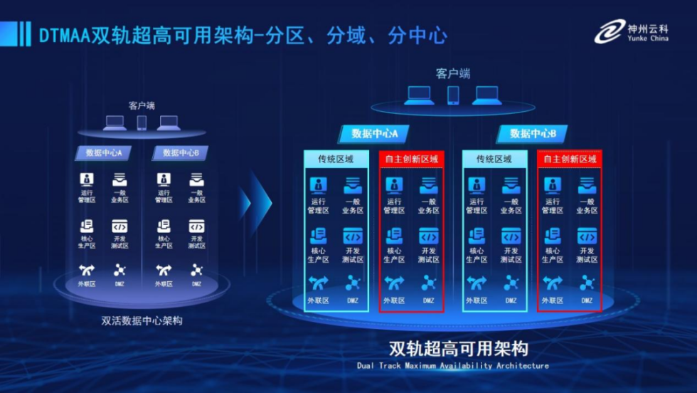 为帮助金融客户更好地应对数字经济时代对可持续性的高要求,实现“信创”与“数字化”齐头并进,韦德国际1946推出了双轨超高可用架构。该架构在双活数据中心的分区调度基础上,增加信创域和非信创域的分域调度,实行信创域与传统域应用全量部署,使双中心运营变为双中心四区域并行运行,互为多活,将“0到1”的单轨建设道路变为分区分域协同的多活双轨超高可用架构。帮助客户在新架构下,保障“信创”的同时解决性能瓶颈,提升稳定性,保证应用可持续性,最终实现信创区域和非信创区域的平滑过渡,完成国产化替代目标。